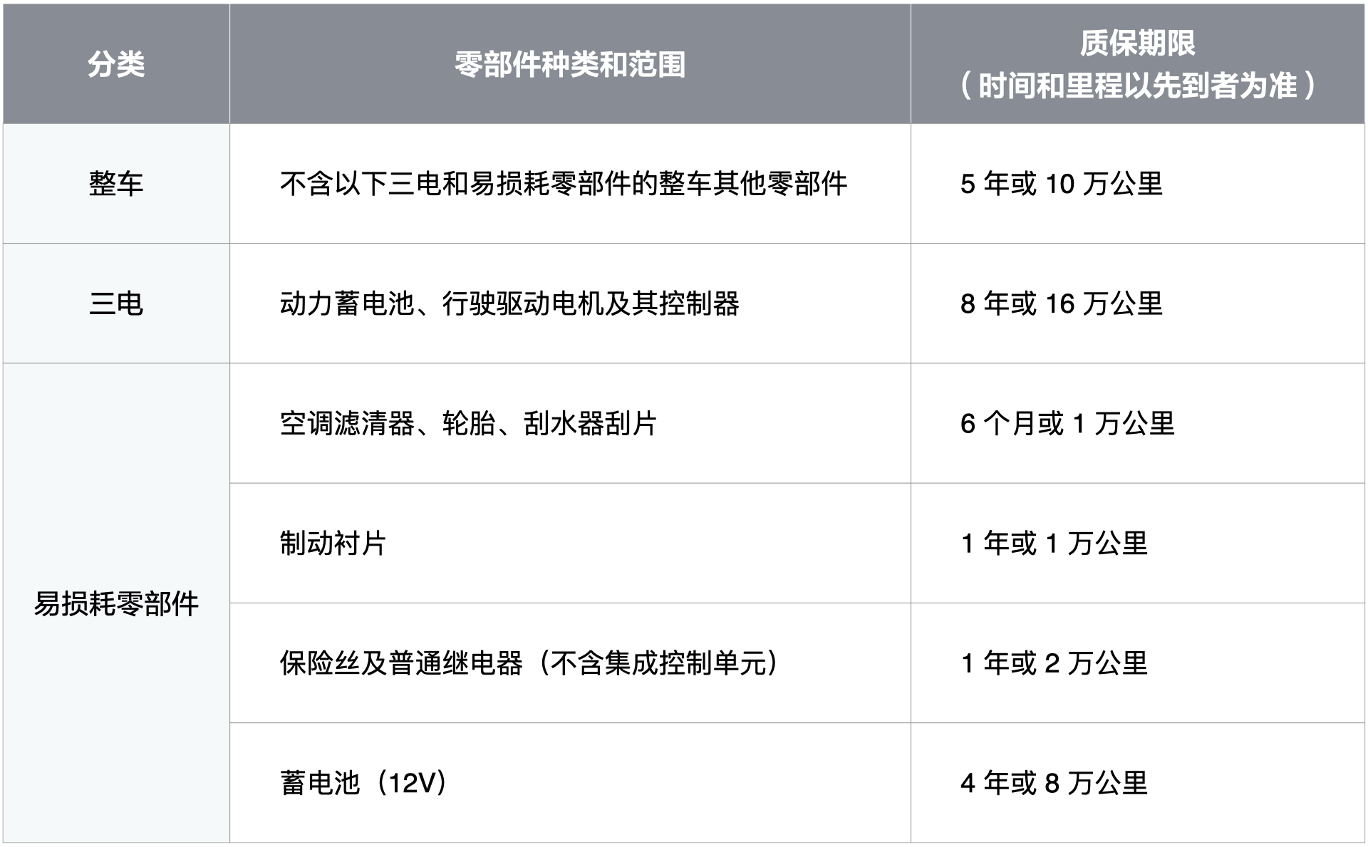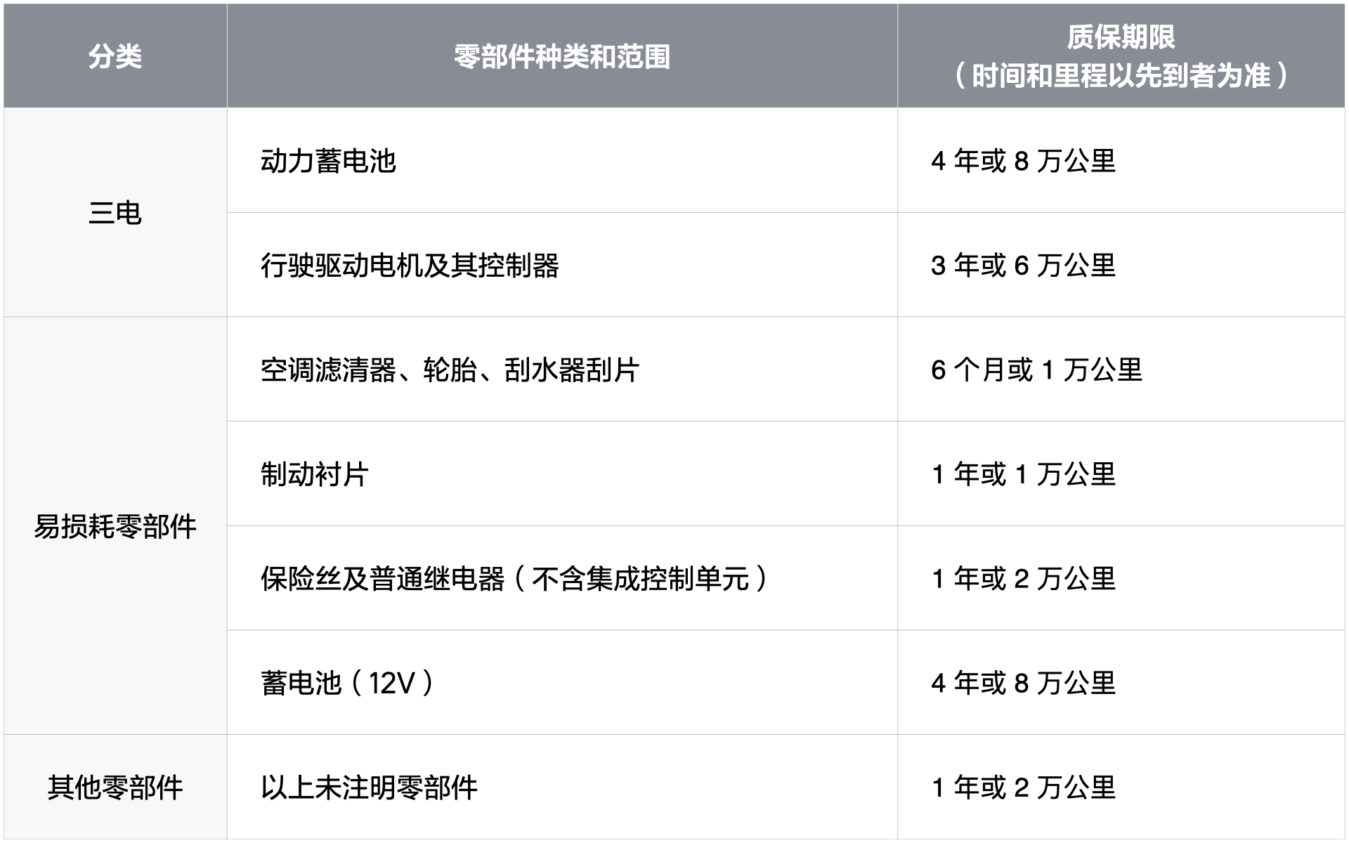 整车质保期按零部件所属种类和范围分别如下,以向用户交付新车之日起计算。